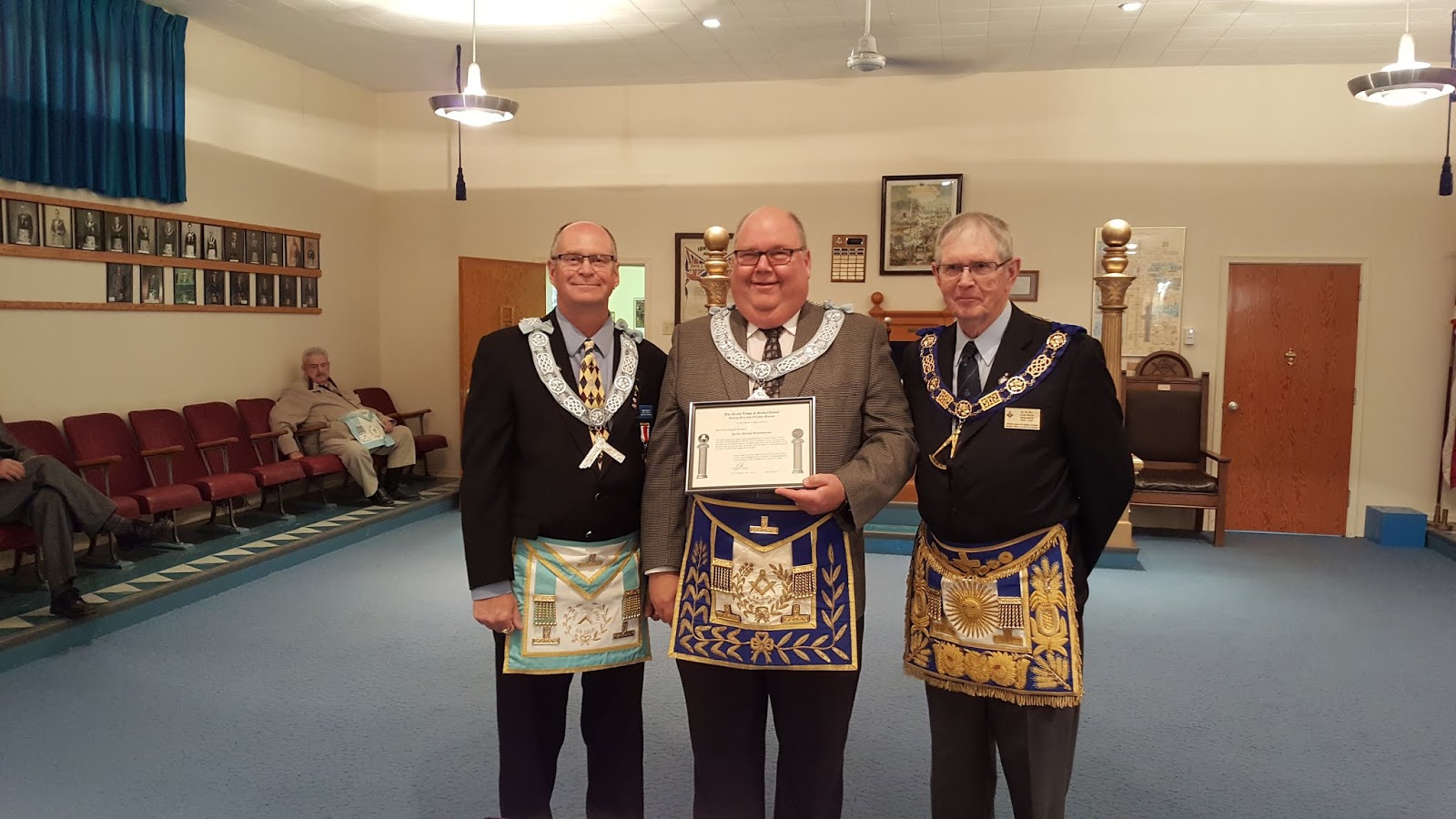 R.W. Bro. Kevin Monsebroten receiving his Past Masters Certificate for 2017.