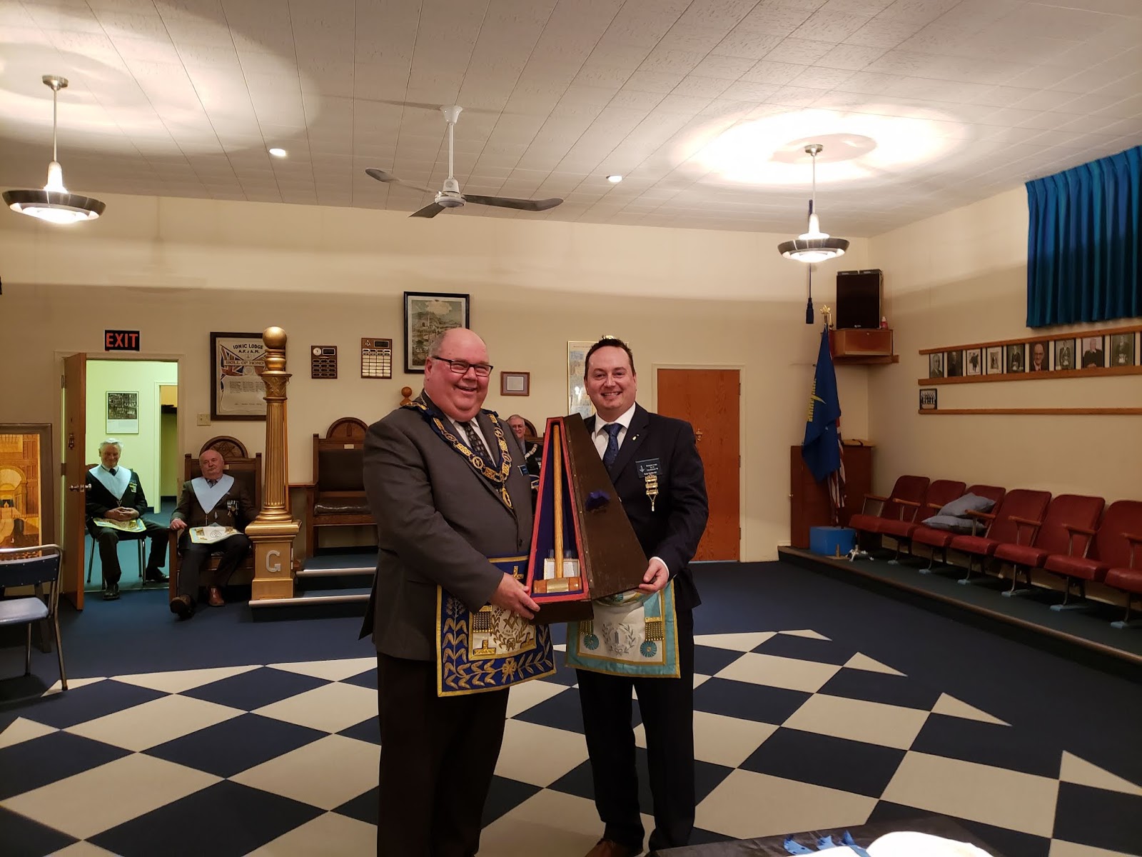 R.W. Bro. Levin Monsebroten haply receives the Traveling Mall from Bro. Swiderski